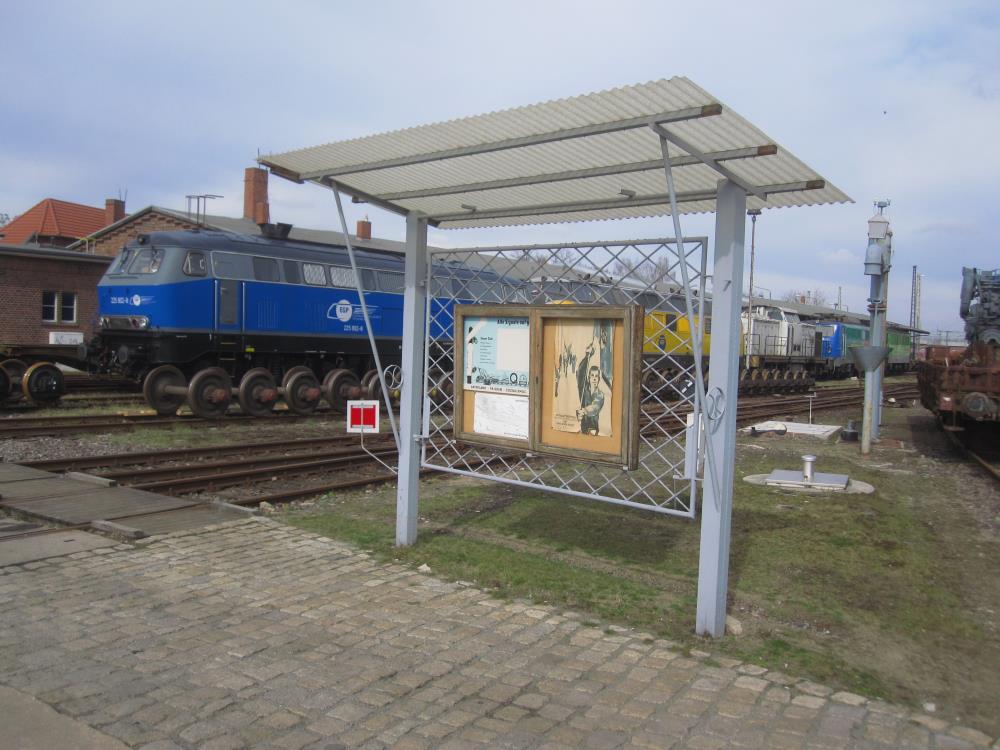 Auf dem Weg vom Pförtnergebäude zum Lokschuppen befindet sich eine überdachte Aushangtafel, in der zu Betriebszeiten der Deutschen Reichsbahn betriebliche Aushänge angeschlagen waren. Heute hängen hier ein Orientierungsplan für die Besucher und etwas zeitgenössische Propaganda aus den späten 1960er Jahren.