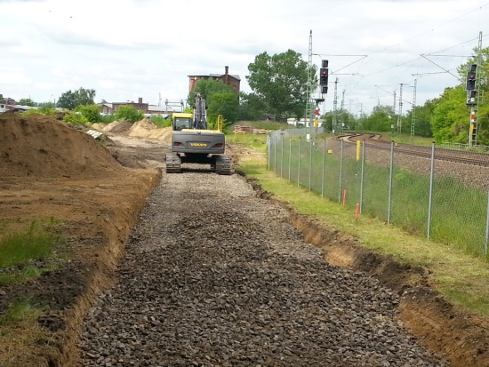 Im Laufe der vergangenen Woche haben vorbereitende Arbeiten für den weiteren Gleisbau im Bahnbetriebswerk Wittenberge begonnen. Ziel ist es, eine direkte Verbindung der beiden Teile der Anschlussbahn des Vereins herzustellen. Dazu wird parallel zu den heutigen Gleisen der DB AG in Richtung Elbbrücke ein Gleis bis zu unserer Grundstücksgrenze gebaut, das über eine Weiche mit der ehemaligen Magdeburger Bahnhofsseite verbunden wird. Das Bild zeigt die Situation am 17.5.2014. Rechts vom Bagger geht es demnächst in Richtung Lokschuppen, links davon in Richtung Bahnhof.