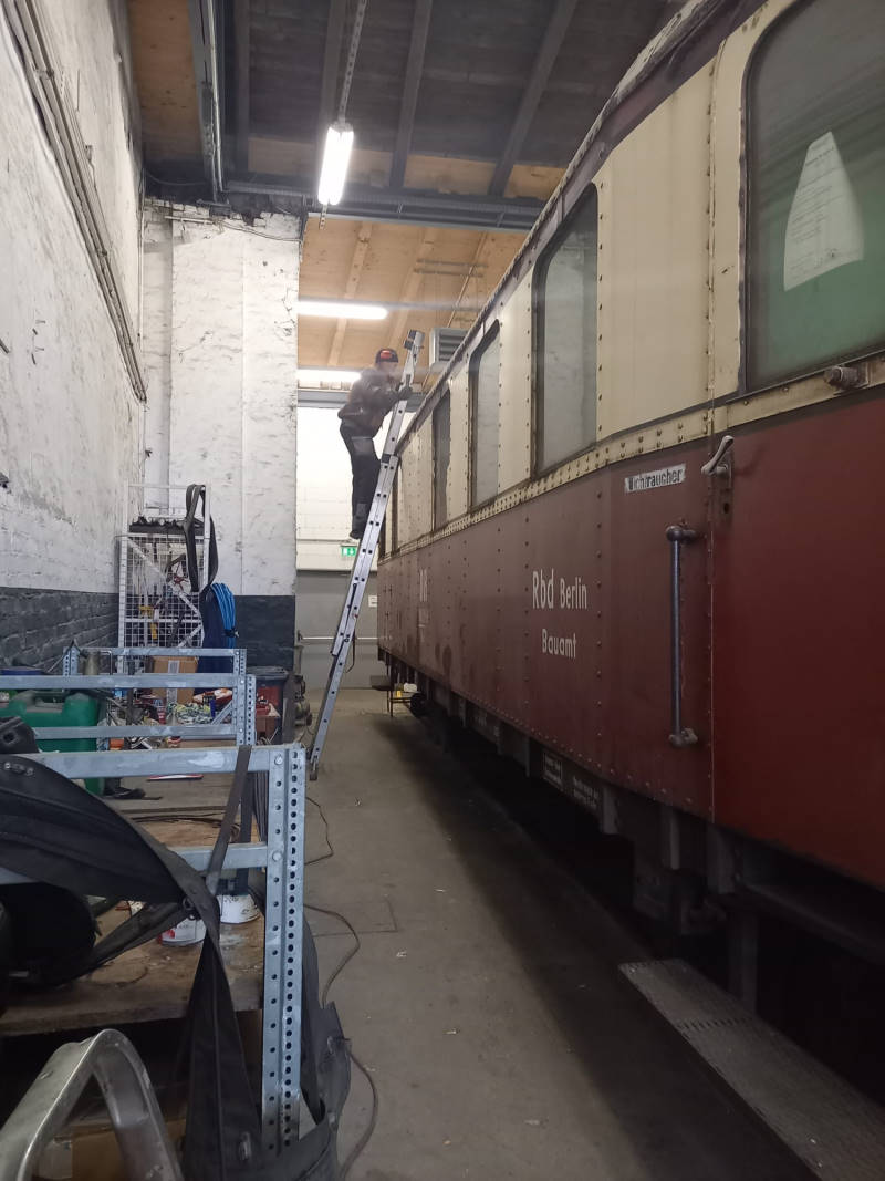 Die Arbeiten am Beiwagen 190 851 sollen nun intensiviert werden. Nachdem die Diesellok 102 076 aus unserer Reparaturhalle ausgezogen ist, konnte der Wagen hierher gebracht werden. In den nächsten Wochen und Monaten wird seine Außenhaut komplett saniert.