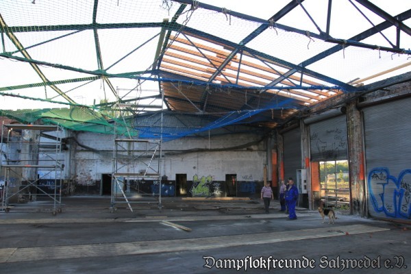 Inzwischen sind die Arbeiten am Lokschuppen Wittenberge weiter vorangeschritten. Fast der gesamte Dachbelag wurde entfernt, so dass es im Lokschuppen ungewöhnlich hell ist.