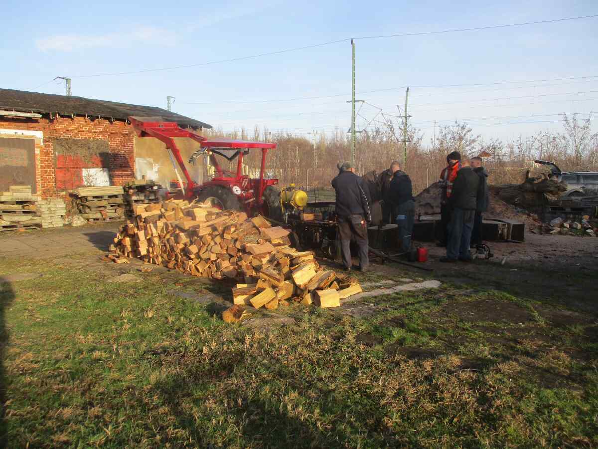 Ganz untypisch für ein Eisenbahnmuseum erscheint es, dass wir jede Menge Holz zu spalten hatten. Das wird benötigt, um unsere Dampfloks in der Saison anzuheizen. Im Winter nutzen wir es auch, um den Kaminofen im Stellwerk zu befeuern. Glücklicherweise haben wir nun einen Trecker, mit dem wir einen Holzspalter betreiben können. Und so wurde der Sonnenschein des vergangen Wochenendes genutzt, um die noch vorhandenen Baumstämme mit Kettensägen in Scheiben zu sägen und anschließend zu spalten.