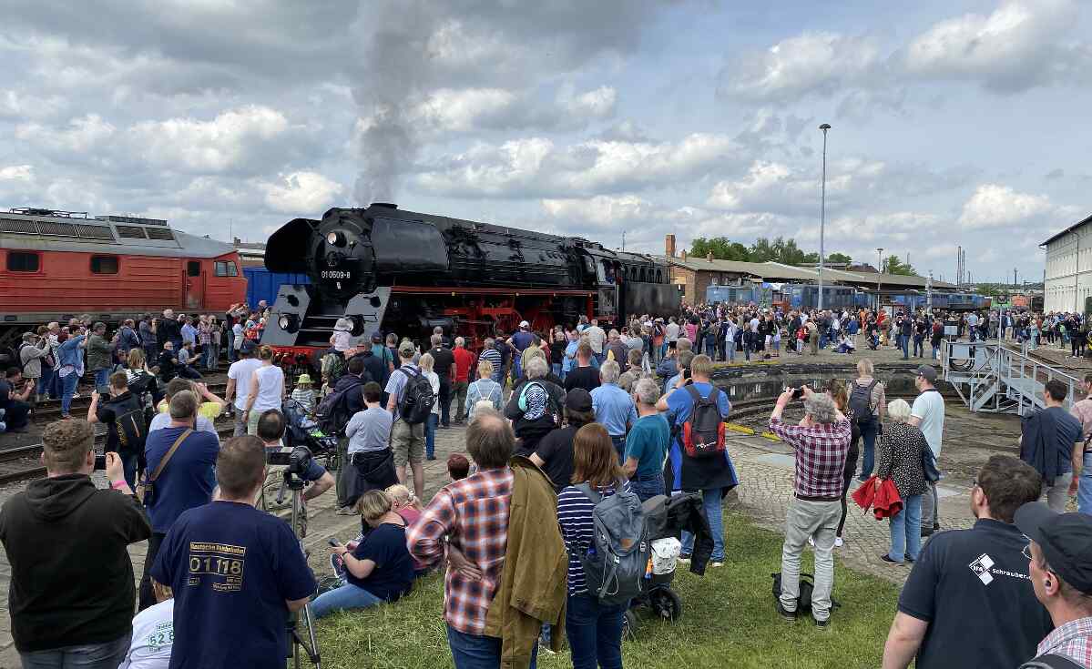 Erschöpft, aber überglücklich schauen wir auf das vergangene Wochenende zurück. Es war bisher sicher in jeder Hinsicht ein Spitzenerlebnis nicht nur für uns, sondern auch für unsere Besucher. So war der Samstag der Tag der Rekorde. Bei bestem Wetter besuchten uns gut 1.700 Menschen aus nah und fern, so viele wie noch nie an einem Tag. Das hatte wahrscheinlich seinen Grund darin, dass wir auch eine Superlative an Exponaten zu bieten hatten, von denen viele in Betrieb vorgeführt werden konnten. Insgesamt waren neben unseren eigenen Fahrzeugen vier auswärtige Dampfloks, drei Dieselloks, eine Elektrolokomotive und zwei Triebwagen zu bestaunen.