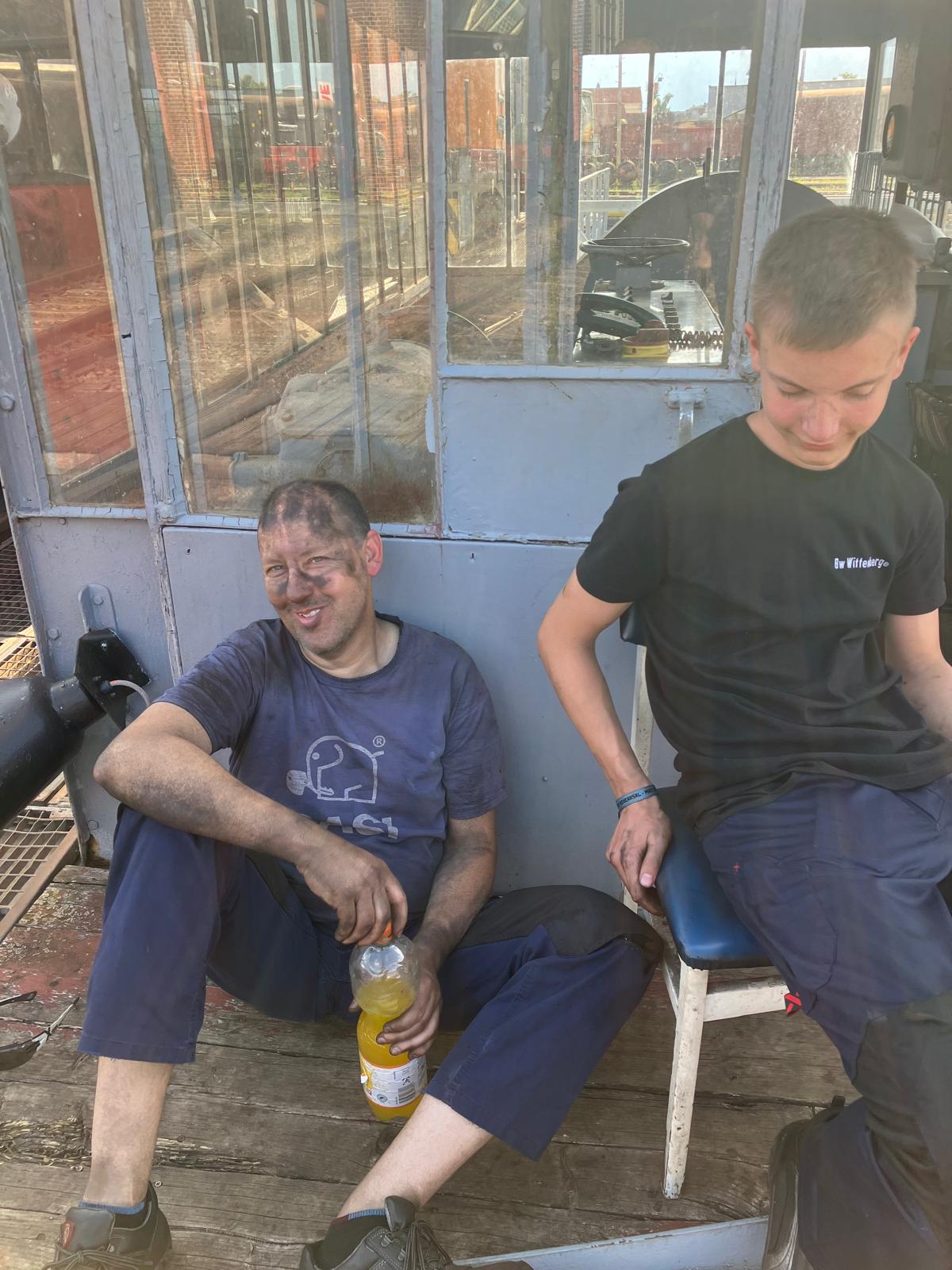 Zudem wurden die sogenannten Überhitzerelemente aus dem Kessel ausgebaut. Dabei handelt es sich um Rohrschlangen, in denen der frisch erzeugte Dampf noch einmal extra erhitzt wird, um den Wirkungsgrad der Dampfmaschine zu erhöhen. Der Ausbau ist in der Regel sehr anstrengend, denn die Befestigungen dieser Elemente sind meist so festgegangen, dass man sie nur mit Erhitzen und großem Kraftaufwand lösen kann. Am Ende freut man sich auf jeden Fall auf die Dusche (und ein kaltes Bier).
