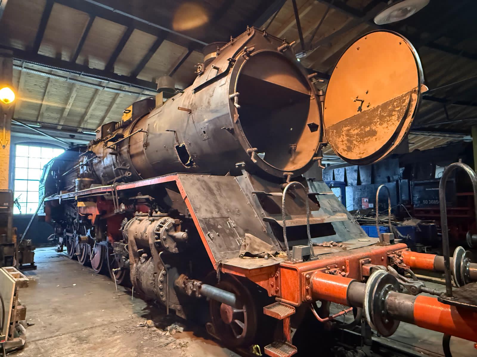 Vor Ort können sich die Besucher außerdem über unser nächstes Projekt informieren. Diesmal geht es um die Dampflok 50 3682, die jahrelang Zugpferd unseres Vereins war. Leider mussten wir sie 2019 abstellen, weil einige Schäden aufgetreten waren, die eine umfangreichere Reparatur erfordern. Wir haben nun mit den Arbeiten begonnen und zunächst den Stehkessel freigelegt. Dabei handelt es sich um den Teil des Lokomotivkessels, in dem sich die Feuerkiste befindet. Außerdem wurden alle Armaturen auf dem Führerstand abgebaut, damit sie aufgearbeitet werden können.