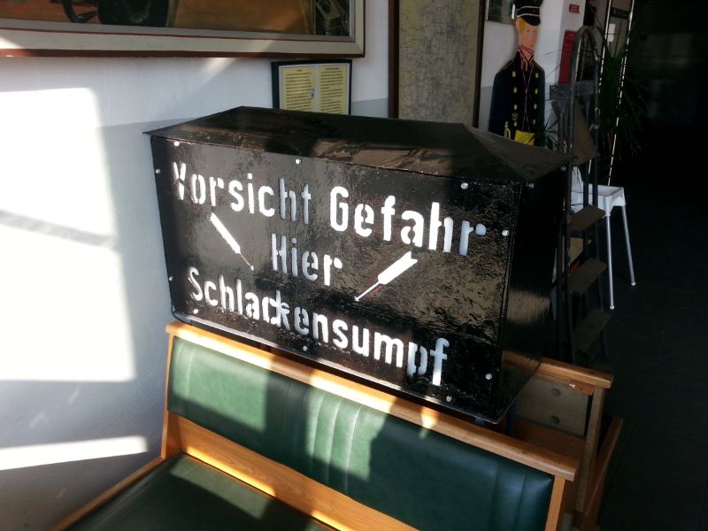 Dieses beleuchtete Schild stand bis Ende 1970er Jahre im Bahnbetriebswerk Rheine und wies die Beschäftigten darauf hin, dass sich hinter dem Schild ein sogenannter Schlackensumpf befand. Hier wurden in einer großen Grube heiße Verbrennungsrückstände von Dampflokomotiven, d.h. Schlacke und Lösche, mit Wasser abgelöscht und bis zum Abtransport zwischengelagert.