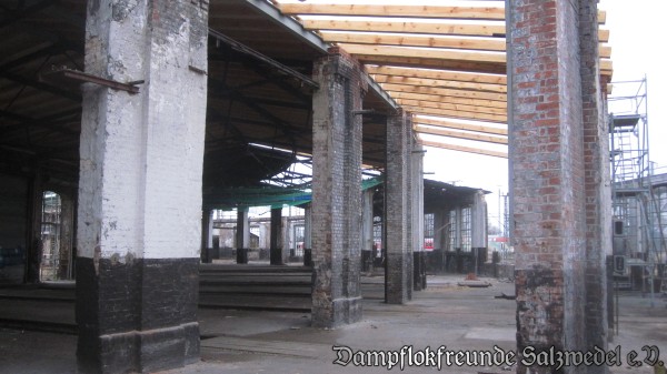 Inzwischen sind die Arbeiten am Lokschuppen Wittenberge weiter vorangeschritten. Fast der gesamte Dachbelag wurde entfernt, so dass es im Lokschuppen ungewöhnlich hell ist.