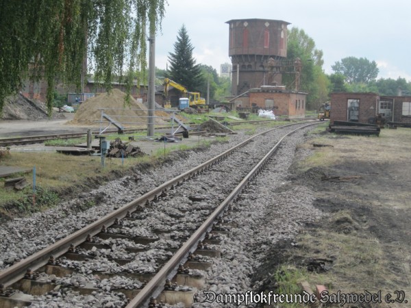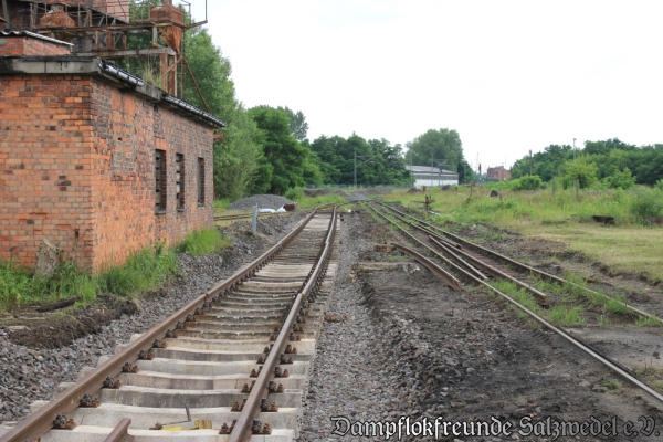 Weitere Fortschritte machen auch die Gleisanlagen außerhalb der Lokschuppenanlage. So wurden die Zufahrtsgleise zur Drehscheibe wiederhergestellt. Derzeit werden die Gleise zur und an den Untersuchungsgruben neu verlegt und gestopft.