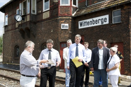 Heute übergab Rainer Bretschneider, Staatssekretär im Ministerium für Infrastruktur und Landwirtschaft des Landes Brandenburg, den Fördermittelbescheid für die Sanierung des historischen Lokschuppens II und des Stellwerkes "Wm" an den Bürgermeister der Stadt Wittenberge, Dr. Oliver Hermann. Die Stadt Wittenberge erwarb im Jahr 2010 das Gelände des ehemaligen Bahnbetriebswerkes (Bw) Wittenberge von der Deutschen Bahn AG. Das Industriedenkmal wird nach Abschluss der Bauarbeiten die neue Heimat der Dampflokfreunde Salzwedel e.V. (DLFS) und deren Fahrzeugsammlung. "Mit der Übergabe des Fördermittelbescheides sind die Weichen für den Umzug von der Altmark an die Elbe gestellt", freut sich Vereinsvorsitzender Burkhard Bohn.