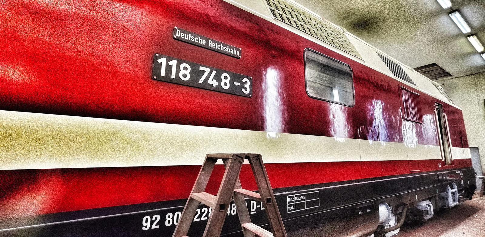 Nach Abschluss der technischen Arbeiten hat sie in den letzten Tagen eine neue Lackierung erhalten hat und erstrahlt jetzt wieder im alten Glanz in rot/weißer Farbgebung. Die ersten beiden Fotos zeigen sie vor einigen Tagen noch in der Lackierhalle einer bekannten Eisenbahnwerkstatt in Klostermansfeld. Keine Angst, die schwarzen Streifen, die im Lack der Lok zu erkennen sind, reflektieren nur die Umgebung.