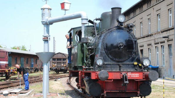 "Seit vergangener Woche haben wir auch den Wasserkran. In den Monaten zuvor haben wir eine 300 Meter lange Rohrleitung zum Wasserturm verlegt", erklärte der Vorsitzende der Dampflokfreunde Salzwedel, Burkhard Bohn. Und am Wochenende konnten die zahlreichen Besucher im Historischen Lokschuppen Wittenberge – an beiden Tagen waren es trotz der brütenden Hitze gut 500 – live mit ansehen, wie die Dampfloks mit Wasser aus dem Kran befüllt werden. Die kleine Emma, auf der die Besucher mitfahren durften, fasst an die sechs Kubikmeter Wasser. Sie wurde morgens und mittags befüllt. Die großen Loks benötigen um die 26 bis 28 Kubikmeter.