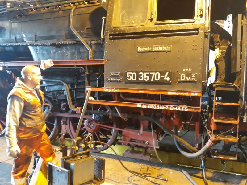 50 3570-4 durch. Damit der „amtliche Stempel“ für die Durchführung der Untersuchung gegeben werden kann, müssen alle Teile an der Lok einwandfrei funktionieren. Da das beim Tender der Lok, also dem „Anhängsel“, in dem die Betriebsstoffe mitgeführt werden, noch einige Arbeiten mit sich zieht, wurde dieser Tender mit dem der Dampflok