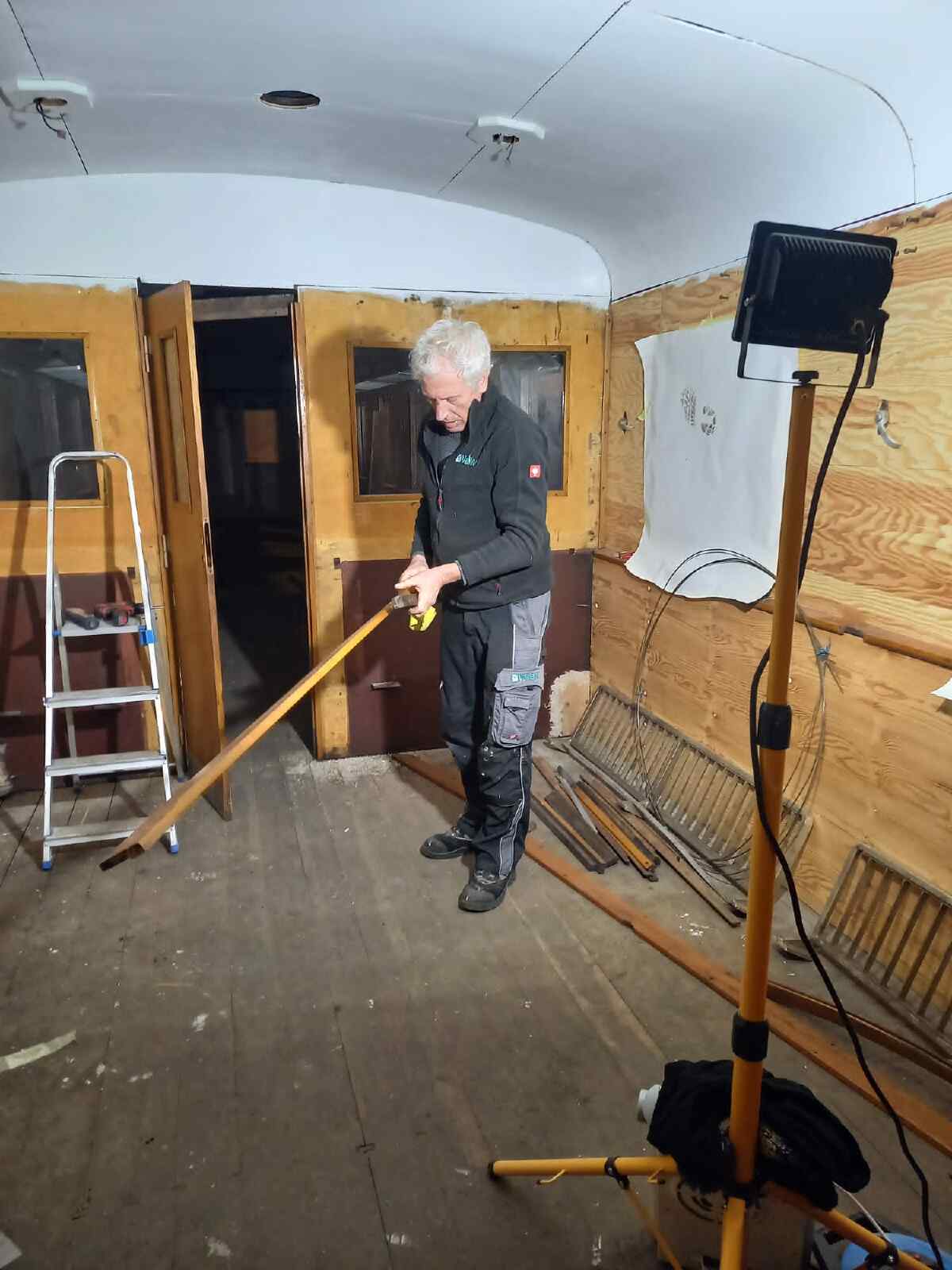 Wir arbeiteten auch weiter am Innenausbau des Wagens 197 805. Dessen Dach und Wände hatten im vergangenen Jahr eine neue Innenverkleidung erhalten, die jetzt weiß gestrichen wurde. Nachdem die Farbe getrocknet war, konnte mit der Montage der Holzleisten begonnen werden, welche die Lücken zwischen den Platten verdecken.