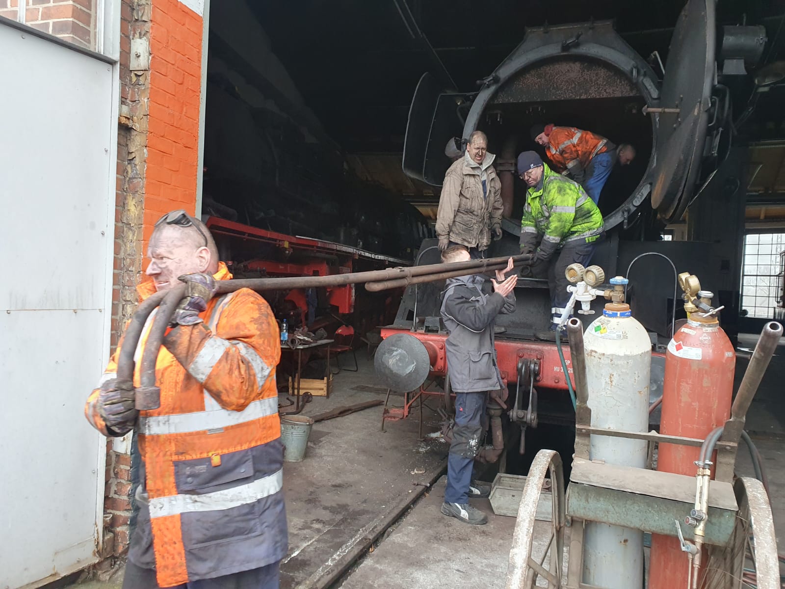 Leider sind die Befestigungsschrauben der einzelnen Elemente im Betrieb der Lok ständig den Abgasen vom Feuer der Lok ausgesetzt. Das führt dazu, dass sich die Schrauben häufig nur schwer lösen lassen und die Muttern zunächst mit einem Schweißbrenner rotglühend erwärmt werden müssen. So dehnen sie ich ein wenig aus und lassen sich dann mit sehr großer Kraftanstrengung abschrauben.