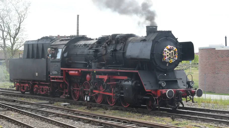 Dennis Kathke hat heute den wohl heißesten Arbeitsplatz auf dem alten Bahnwerk-Gelände in Wittenberge. Er steht im Führerhaus einer mächtigen, schwarzen Dampflok. Hinter ihm die geschlossene Tür zum Feuerherd der alten Dame. Glut schimmert durch die Ritzen. In diesem Monat wird die Lok 80 Jahre alt.