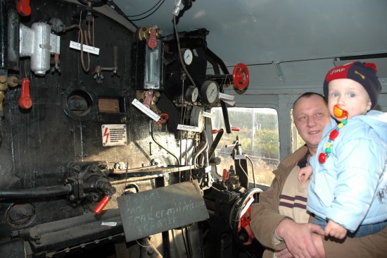 Thomas Kötke aus Böddenstedt untersuchte mit Sohn Martin (2) die faszinierende Technik im Führerstand der 65 Jahre alten Lok 50-3624. |